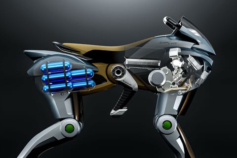 O Corleo é equipado com um motor a hidrogênio de 150cc para geração de energia, com o hidrogênio sendo fornecido por um canister montado na parte traseira. A eletricidade gerada alimenta as unidades de acionamento instaladas em cada uma das quatro pernas, proporcionando uma propulsão eficiente e sustentável.